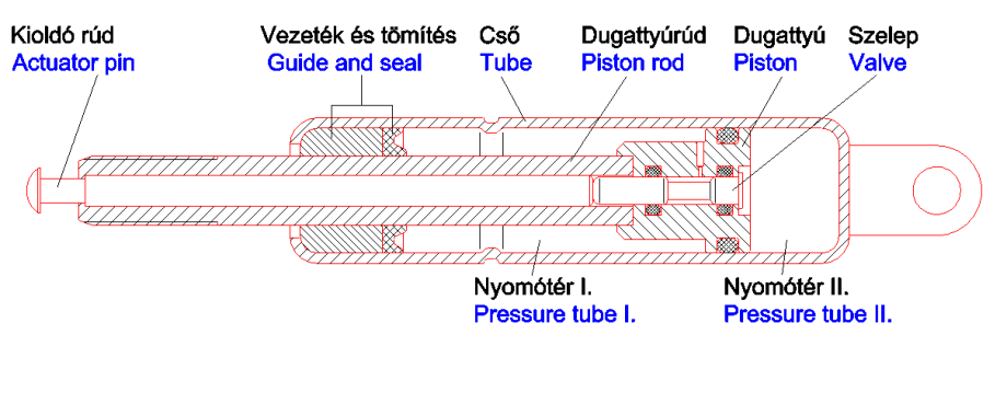 A blokkolható gázrugó abban különbözik a standard változattól, hogy a dugattyúban egy beépített szelep található. Ez a szelep alapesetben zárt, működtetését a dugattyúrúdban kivezetett rudazattal végezhetjük (5. ábra). Nyitott állásban az alkatrész a hagyományos gázrugóknak megfelelően működik.