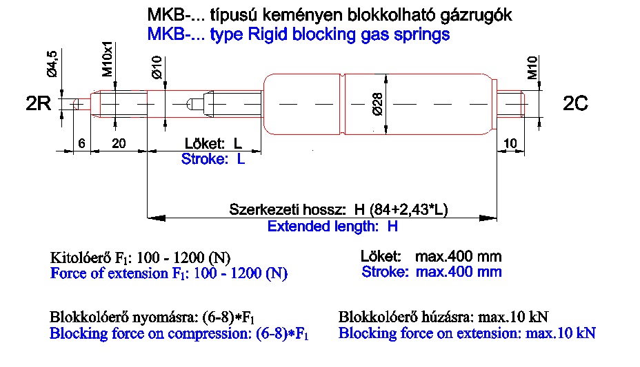 Keményen blokkolható gázrugókat csak 10/28mm-es cső-/rúdátmérővel, csak 3-as csillapítással és csak 2R (M10x1 menet 20mm hosszon) rúdcsatlakozással készítünk.