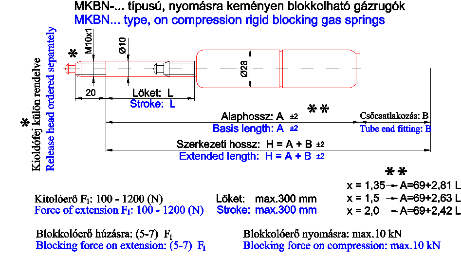 | Típus | Rúd, d [mm] | Cső külső, D [mm] | A | Max. löket, L [mm]* | Kitolóerő, [N]** | Rugótényező, X | |