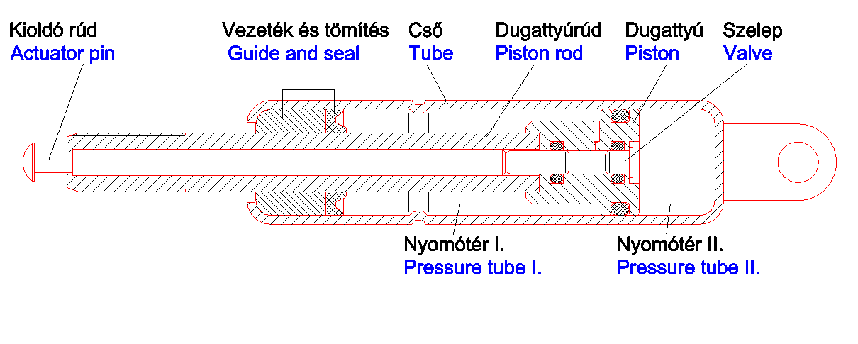 Ez a gázrugó abban különbözik a standard gázrugótól, hogy a dugattyúban van egy beépített szelep. Ez a szelep alapesetben zárt, működtetését a dugattyúrúdban kivezetett rudazattal végezhetjük (5. ábra).A szelep nyitott állásában a gázrugó a standard gázrugónak megfelelően működik. Ha a dugattyú egy adott helyzetében zárjuk a szelepet, a zárt szelep megakadályozza a gáz átáramlását a dugattyú két oldala között. Ennek eredményeként a dugattyú minimális elmozdulása után erőegyensúly alakul ki a dugattyú két oldalán, így az az adott helyen blokkolódik. Mivel a dugattyú mindkét oldalán gáz van ami összenyomható, a blokkolás rugalmas.