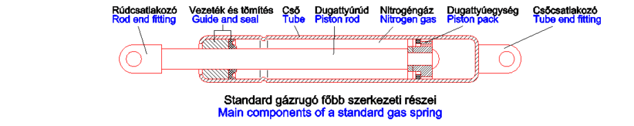 A standard gázrugó egy nagynyomású gázzal feltöltött zárt hengercső és az ebbe betolható rúd egysége (2. ábra). A rúd csőben lévő végén egy réssel ellátott dugattyú helyezkedik el, ezért a dugattyú mindkét oldalán azonos a nyomás. Mivel a dugattyú rúd felőli oldalán a rúd keresztmetszetével kisebb a nyomófelület, ezért a gáz nyomóereje a rudat kifelé tolja.